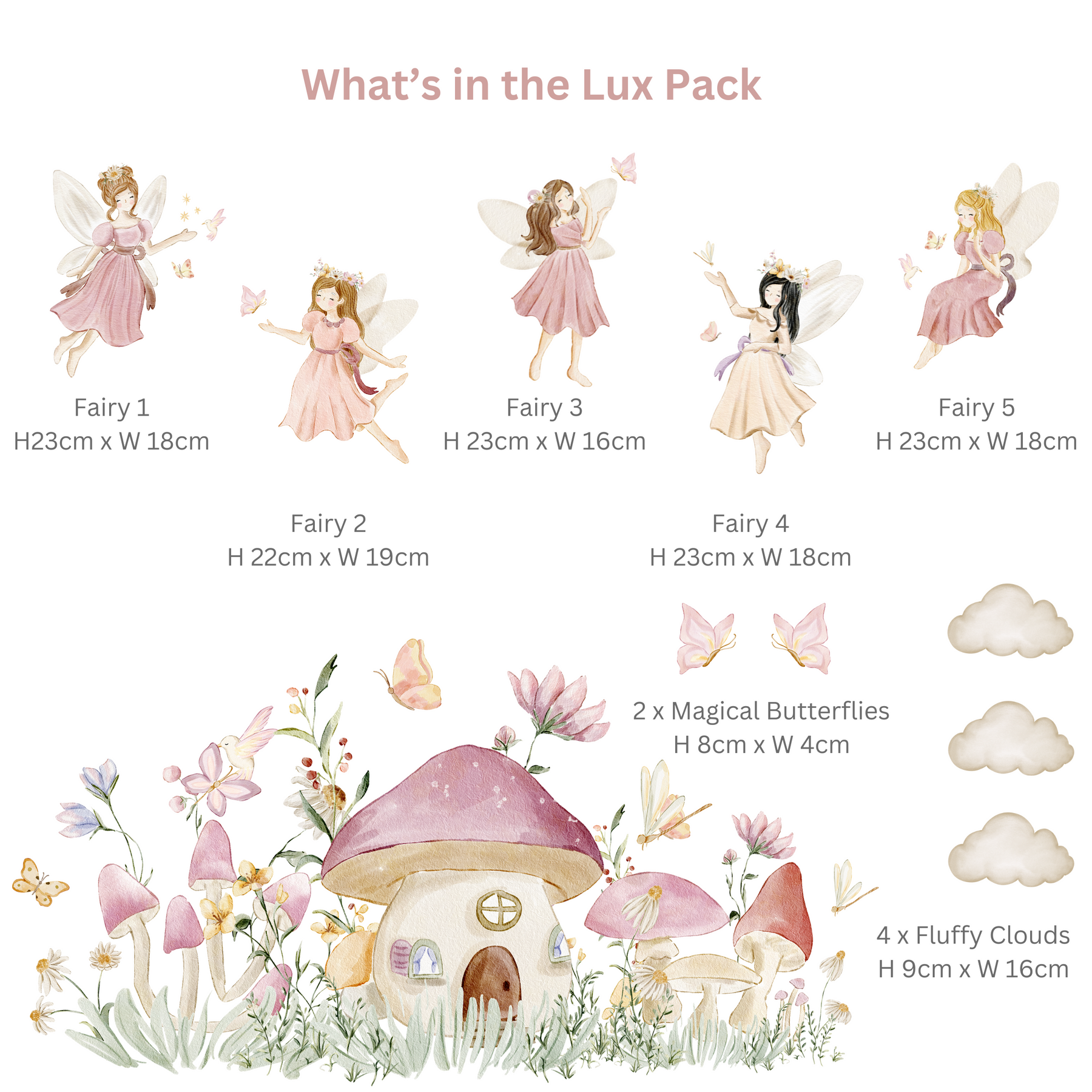 An magical selection of 5 x watercolour fairies, an enchanting Toadstool Flower Garden, Beautiful Magical Butterflies and Fluffy Clouds all to create a stunning magical fairy wonderland.
